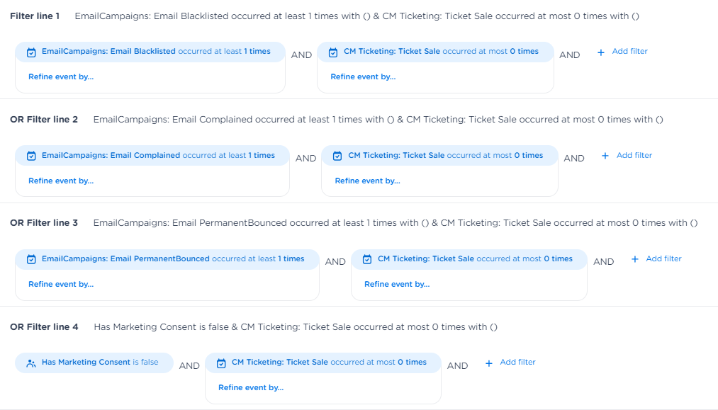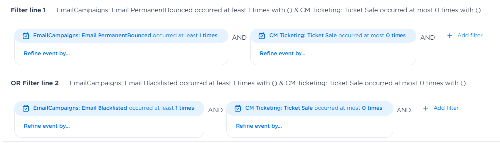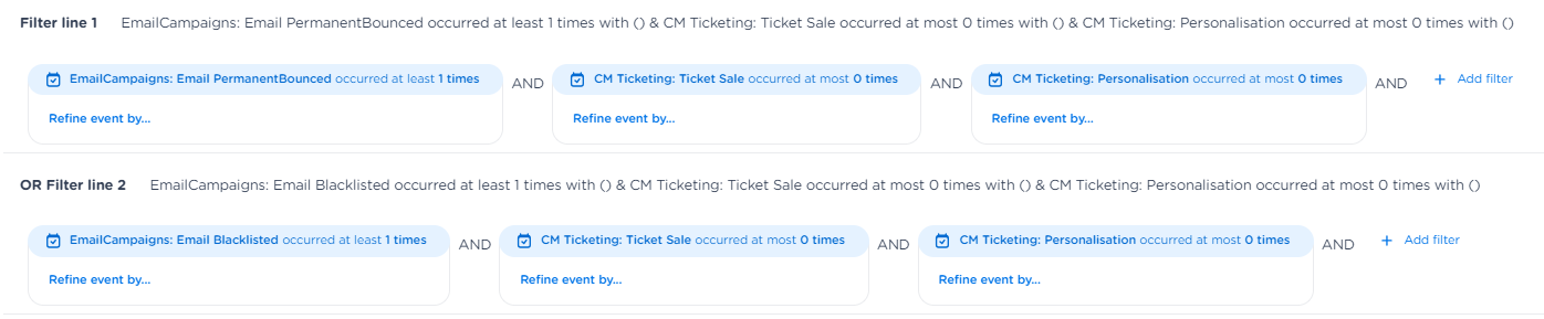 - EmailCampaigns: Email PermanentBounced occured at least 1 times AND CM Ticketing: Ticket sale occured at most 0 times AND CM Ticketing: Personalisation occured at most 0 times