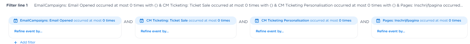 EmailCampaigns: Email Opened at most 0 times AND CM Ticketing: Ticket Sale occured at most 0 times AND CM Ticketing Personalisation occured at most 0 times AND Pages: Name of page occured at most 0 times.