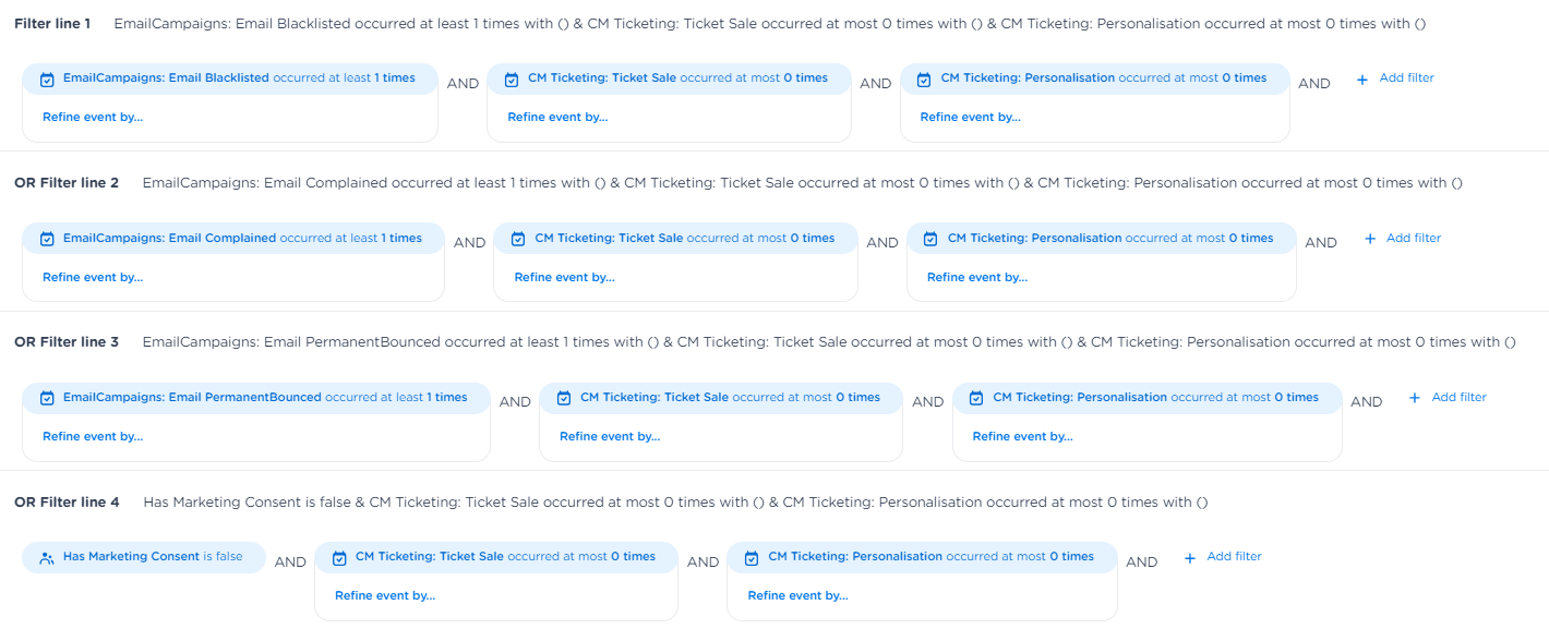 - Has Marketing Consent is false AND CM Ticketing: Ticket sale occured at most 0 times AND CM Ticketing: Personalisation occured at most 0 times