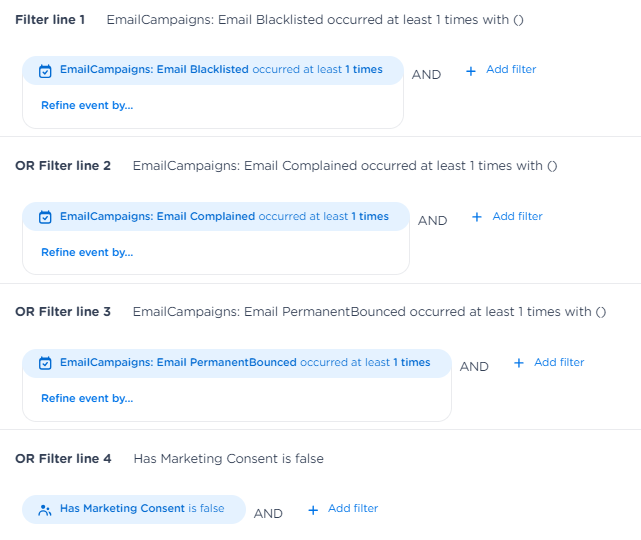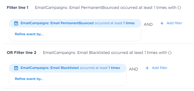 EmailCampaigns: Email PermanentBounced occurred at least 1 times OR EmailCampaigns: Email Blacklisted occured at least 1 times