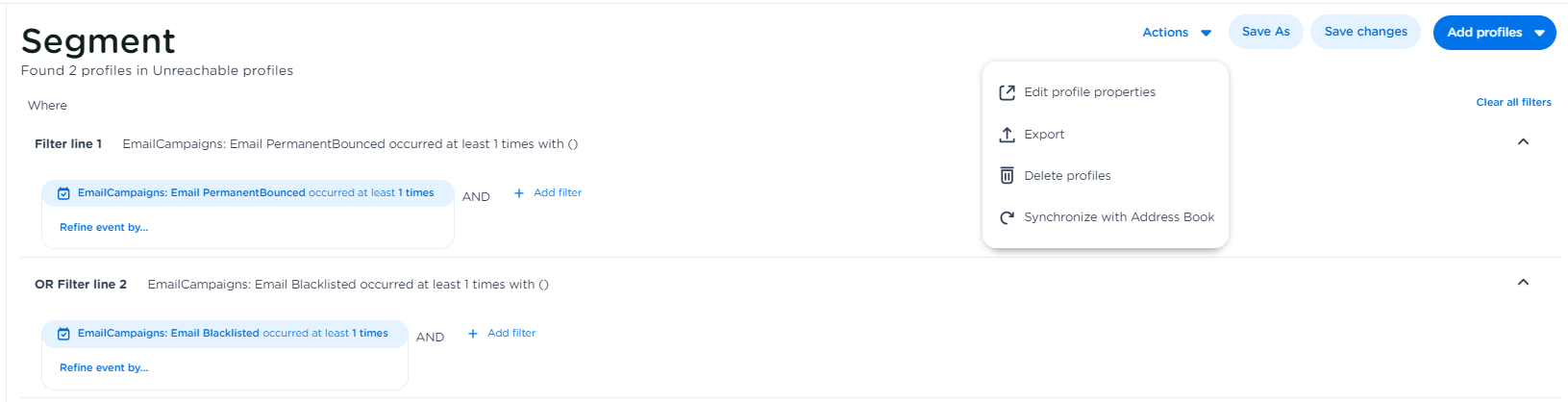 When this segment is created, you now have all unreachable profiles who also did not purchase or personalise a ticket for you event. Therefore these profiles can easily be deleted.