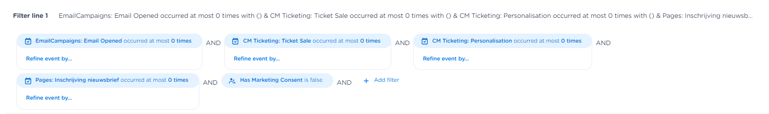 EmailCampaigns: Email Opened at most 0 times AND CM Ticketing: Ticket Sale occured at most 0 times AND CM Ticketing Personalisation occured at most 0 times AND Pages: Name of page occured at most 0 times AND Has Marketing Consent is false.