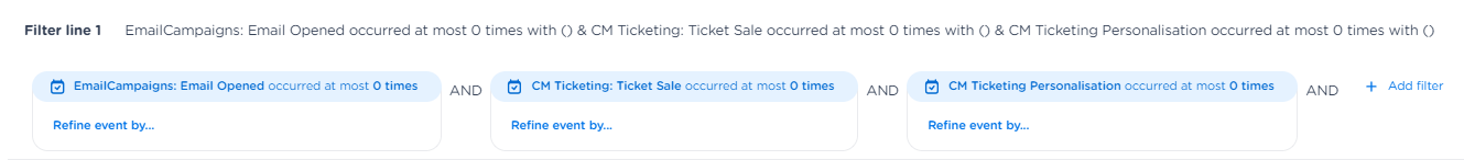 EmailCampaigns: Email Opened at most 0 times AND CM Ticketing: Ticket Sale occured at most 0 times AND CM Ticketing Personalisation occured at most 0 times