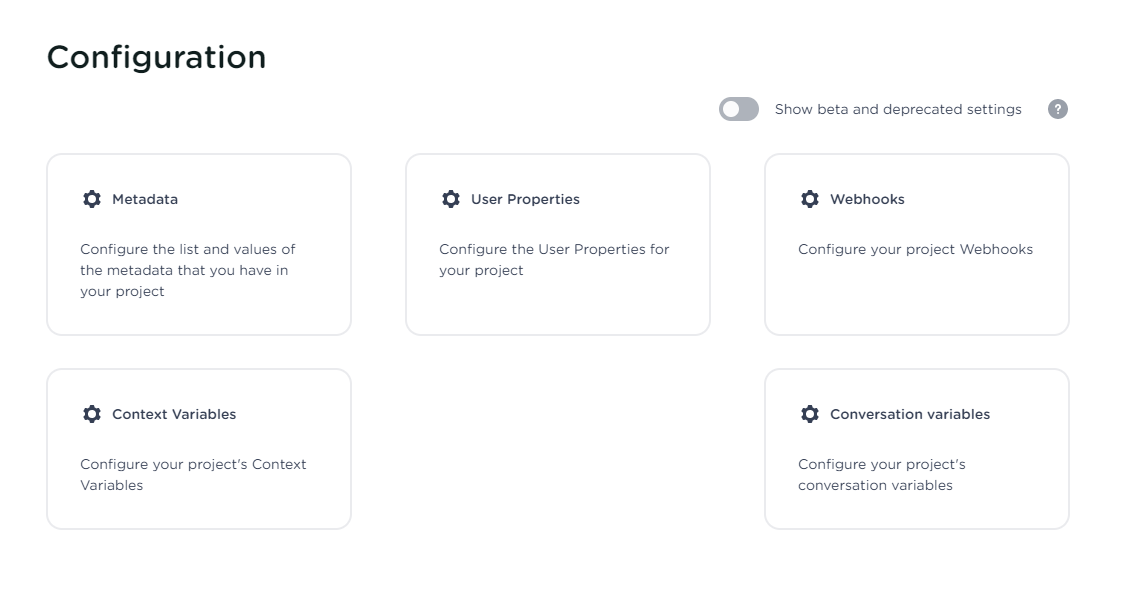 The Configuration Screen in Conversational AI Cloud lets you configure the following elements to use in your project: