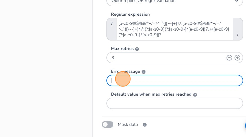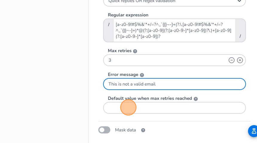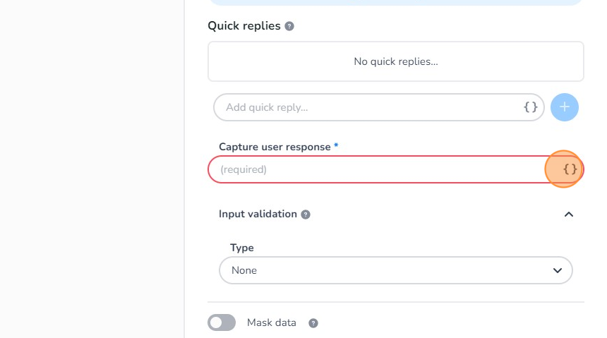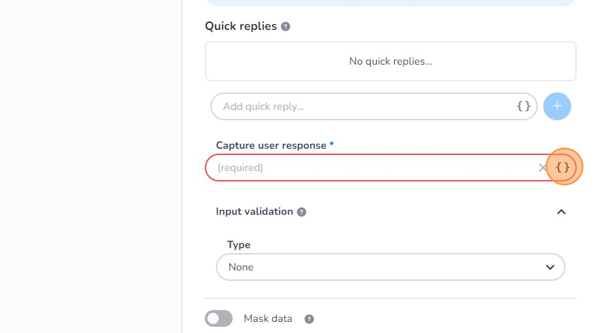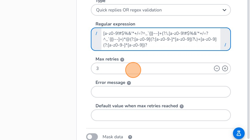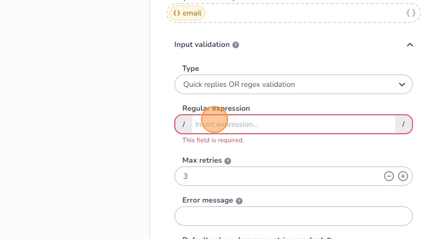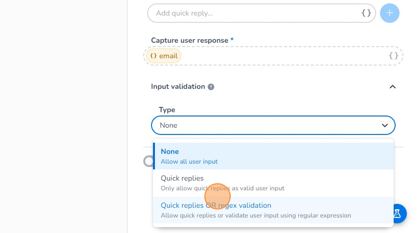 Allow quick replies or validate user input using regular expression" if you want to execute a check on the input of the user. This can be done on quick replies or by Regex validation.