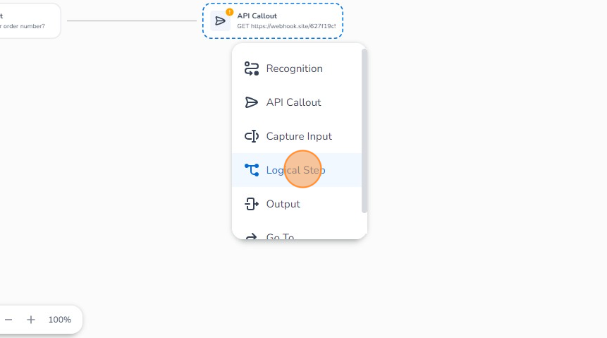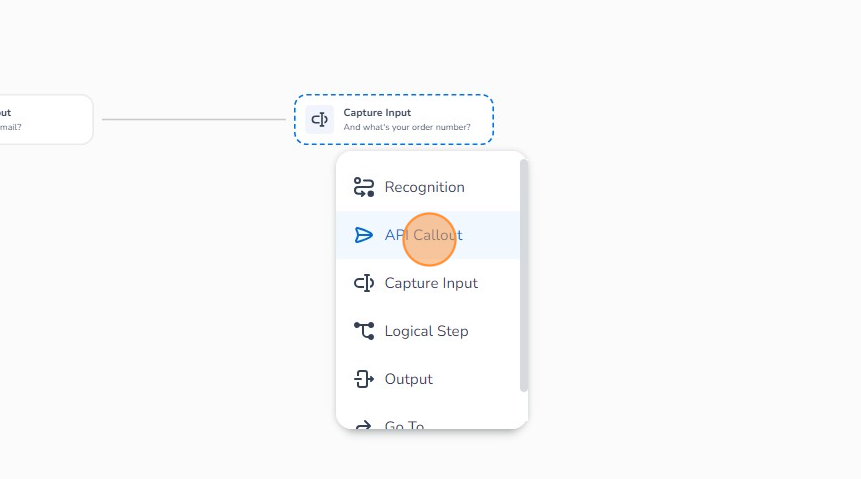 - Performs an API call to an external API using the “API Callout” node type to retrieve an order based on the input provided by the end-user