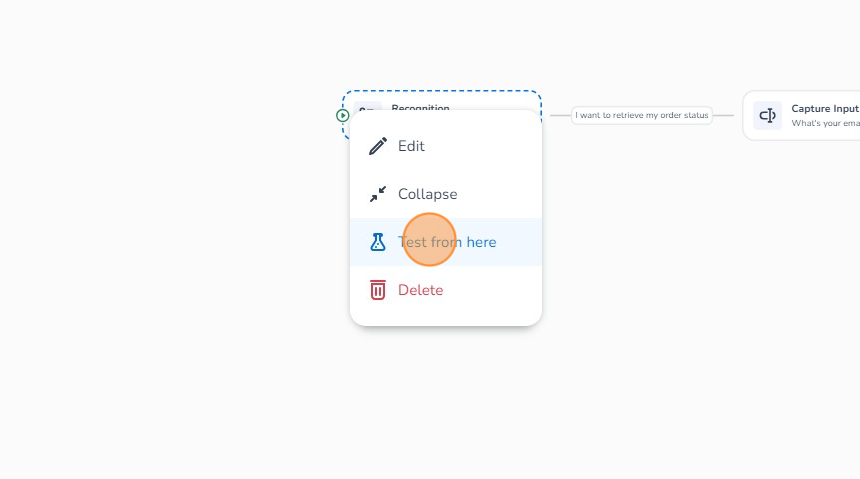 84. Go to your first node and click on: "Test from here" to test your dialog.