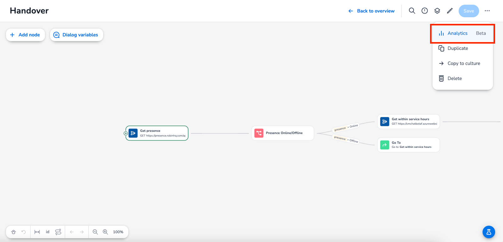 You can also access the Dialog Analytics via the Dialog editor by clicking on the three dots in the upper-right corner: