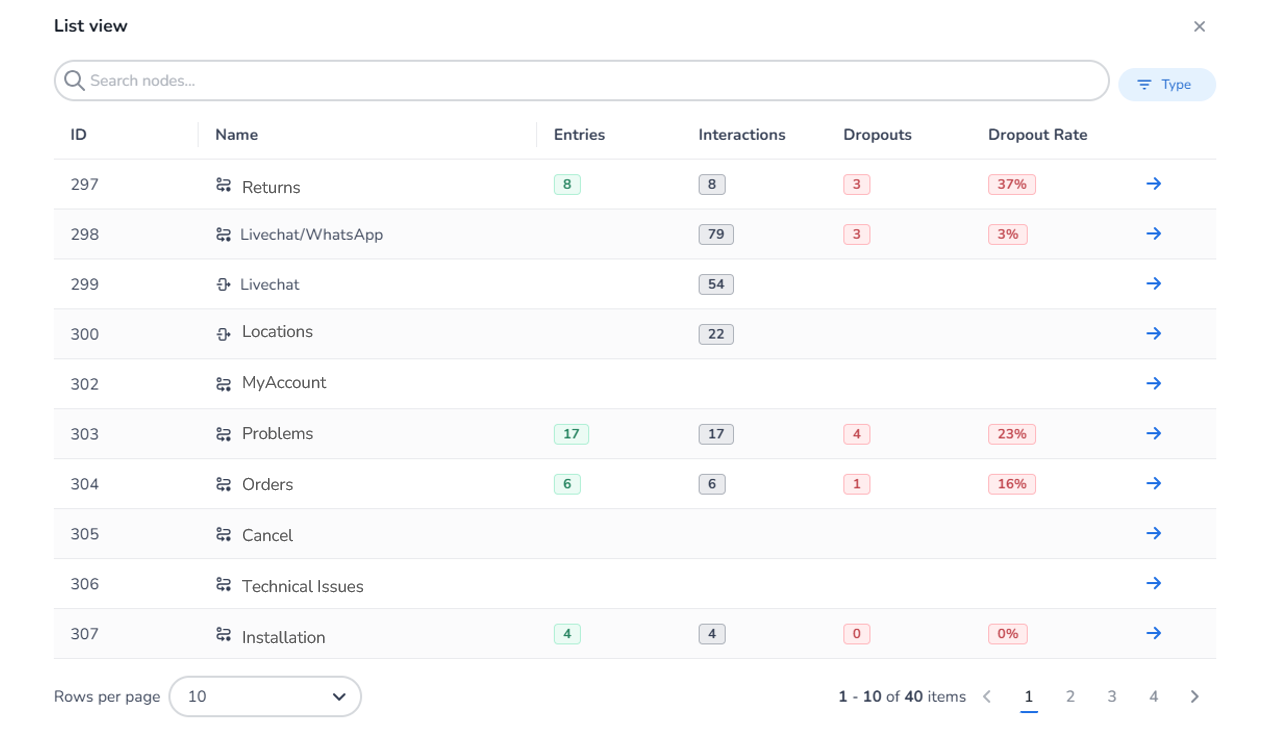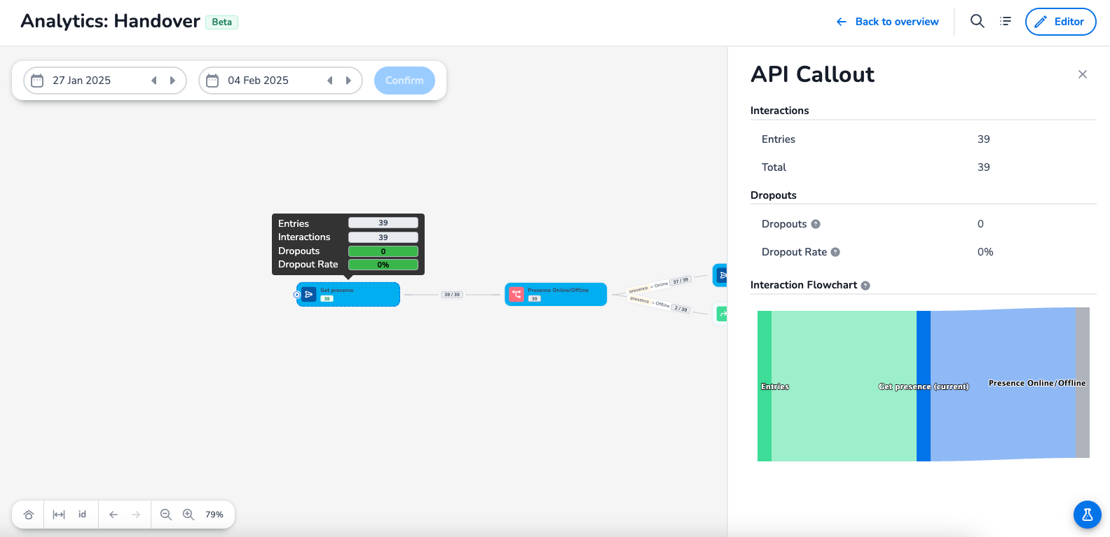 This dialog analytics tool offers an overview of all interactions including the entries and dropouts, within the selected timeframe. Hover over the '?' icon to view explanations of dropouts and the interaction flowchart.