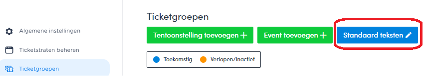 De standaard teksten werken overkoepelend en werken dus voor alle ticketgroepen. Deze knop vind je bovenaan als je naar 'Ticketgroepen' navigeert.