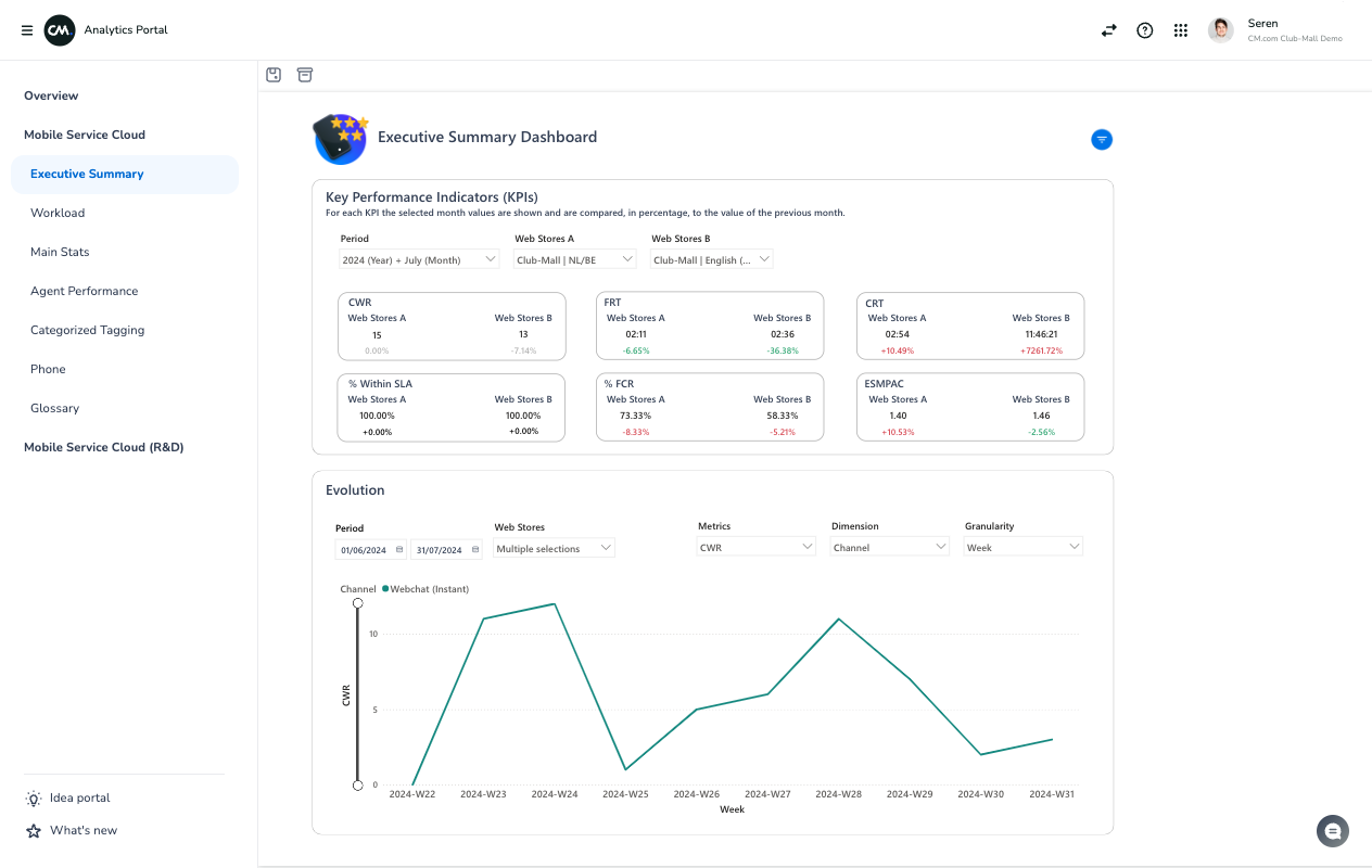 The Executive Summary Dashboard provides an overview of the key performance indicators (KPIs) most relevant to the Agent Inbox domain, including CWR, FRT, CRT, SLA, FCR, and ESMPAC. It enables month-over-month comparisons within individual webstores and between different webstores. For KPIs of particular interest, the dashboard offers detailed trend analysis, allowing you to explore performance patterns over time and across selected webstores, helping you identify trends and areas for improvement.