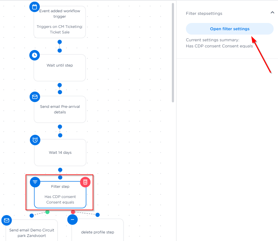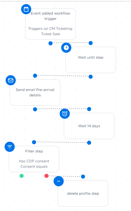 A customer has attended a festival, received pre-arrival details and after his stay we wait 14 days after the festival to see if he has given consent or not in these last 2 weeks by filtering on the consent field in the CDP. If not we will delete his profile, if he did we will send him a nice demo email about the next festival.