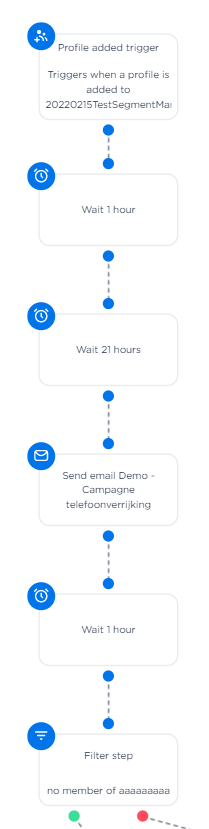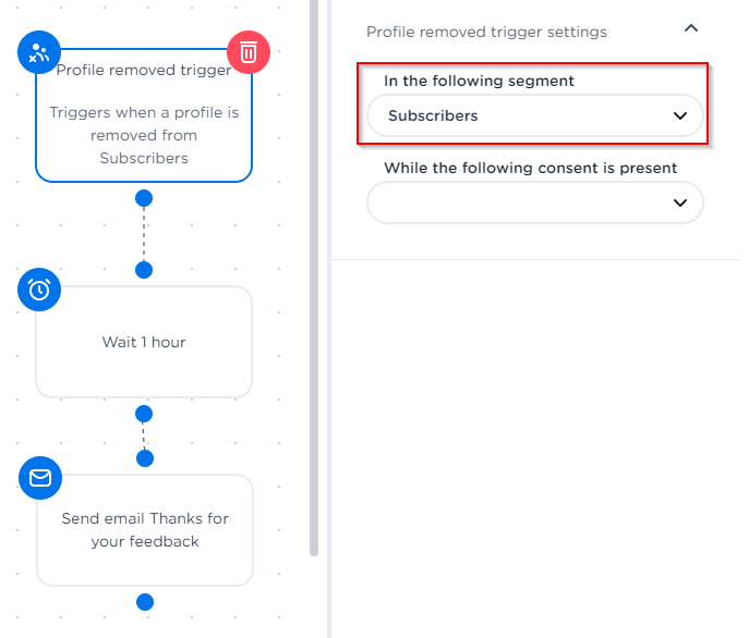 A profile update enters the CDP and this person no longer wishes to receive the newsletter, this causes him to be removed from the Subscribers segment. This action will trigger this workflow, you can send him a confirmation that he has unsubscribed.