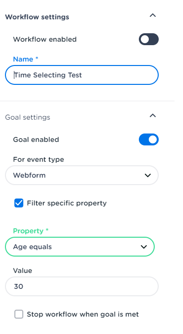 For example, when the event Webform comes in and the event property age has the value 30 then your goal is met and it will add to the goal conversion in your workflow overview.