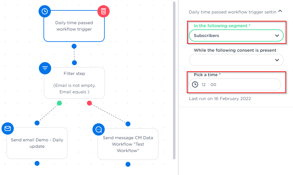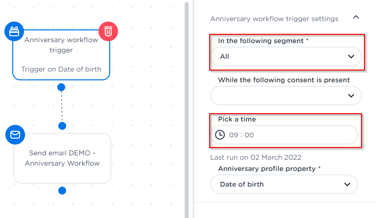 First you need to define a segment for which you want this workflow to start (either with consent or not). Secondly, you need to select a time, then every day at this set time the workflow will start.