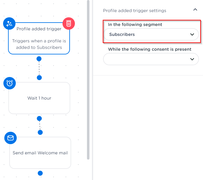 First you need to define a segment for which you want this workflow to start (either with consent or not).
