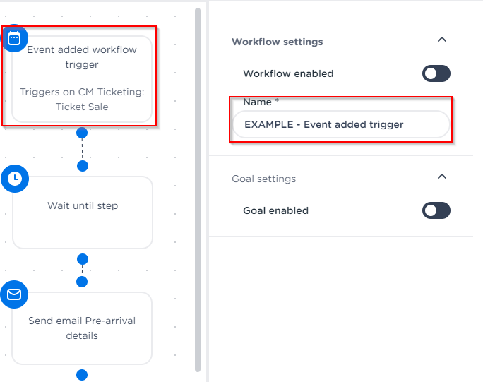 Someone has bought a ticket and based on this incoming event, this workflow will start. You can for example send the customer a pre-arrival email 2 days prior to the event.