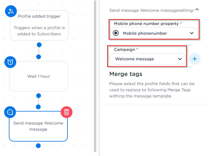 Simply select the profile field that contains the phone number from the Mobile phone number property drop-down and then select the campaign (message) you want to send. Same as is the email step you can use merge tags to make your message more personal. More details on how to use merge tags in campaigns can be found here.
