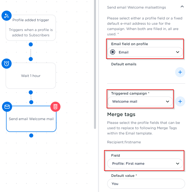 Simply select the profile field that contains the email from the Email field on profile drop-down and then select the triggered campaign you want to send.