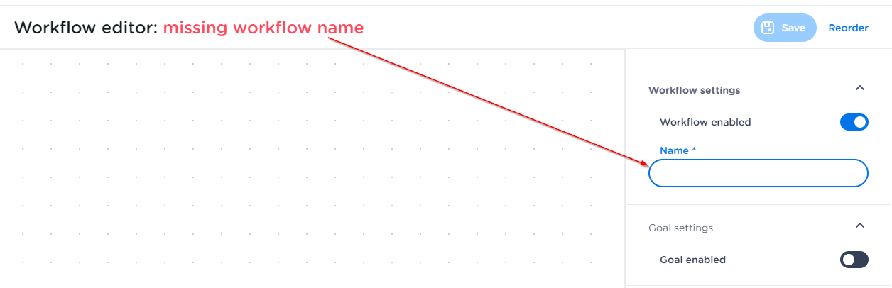 If the workflow is completed you can save it by pressing on the Save button. It will only be clickable if the workflow is completed and all mandatory items are filled. In this example the workflows doesn’t have a name yet, so it cannot be saved.