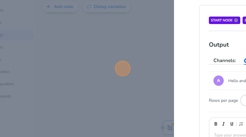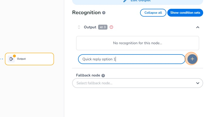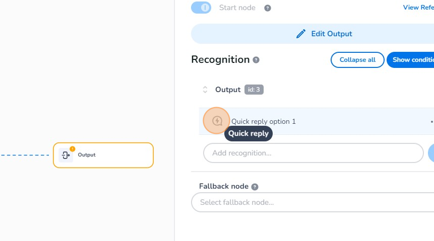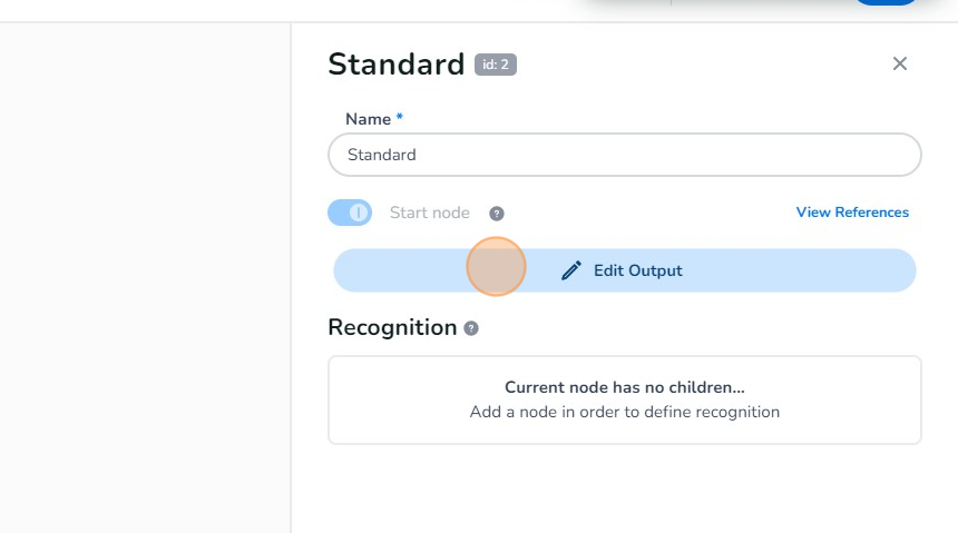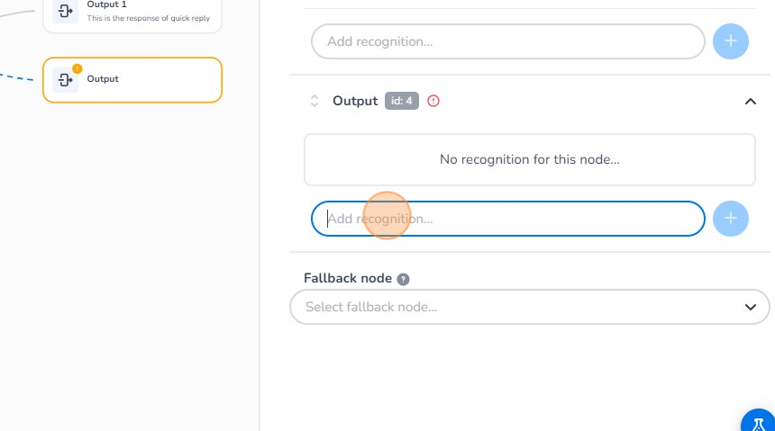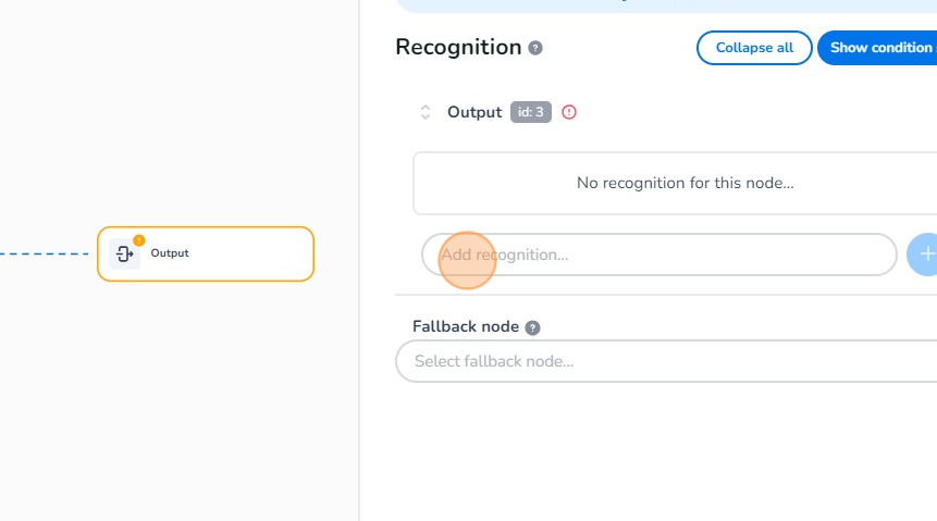 We'll start off by creating a simple start node. To create this, Click on the "+ Add node" button and select the type: 'Recognition'.