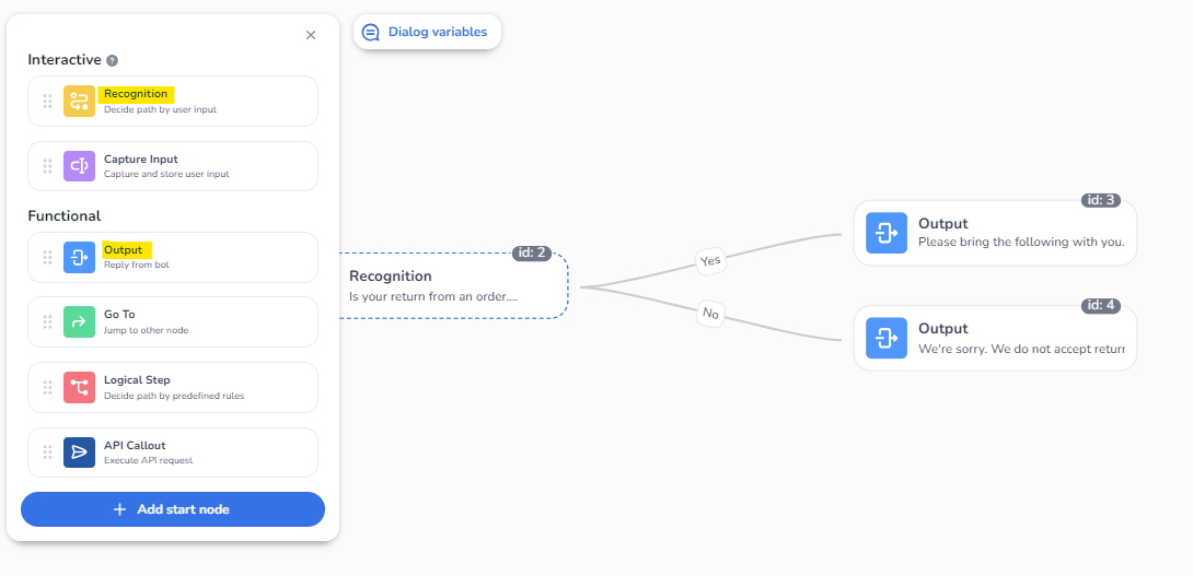 That's all. This is the process of creating a basic start node with various dialog outputs. After following the steps mentioned above your dialog should look like this: