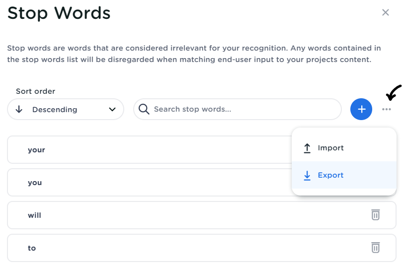 Conversational AI Cloud offers the option of importing multiple stop words at the same time through an import functionality exposed through the stop word screen. Below this guide, you'll find a standard list of stop words that you can download and import into your own project.