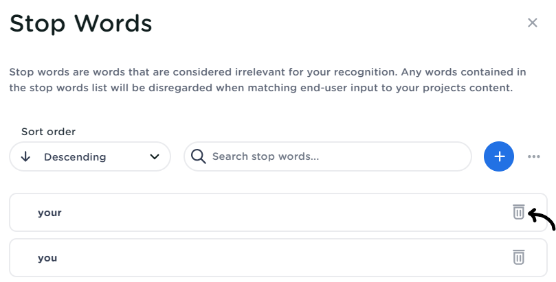 - Go to the entities screen and select the “stop words” button