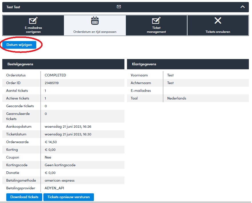 - Klik op de knop 'orderdatum en tijd aanpassen'