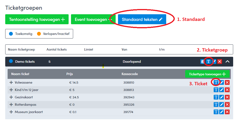 Het is mogelijk om de teksten die op het ticket het staan aan te passen. Dit kan op verschillende niveaus: standaard teksten, op ticketgroep niveau en op niveau van het ticket zelf.
