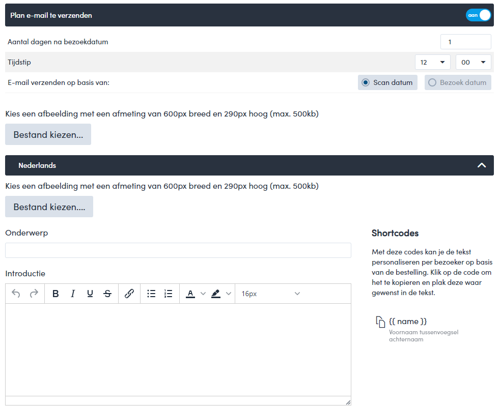 Je moet voor elke taal tekst invullen. Indien je bij een taal geen tekst invult, zullen bezoekers in deze taal geen after-visit mail ontvangen.