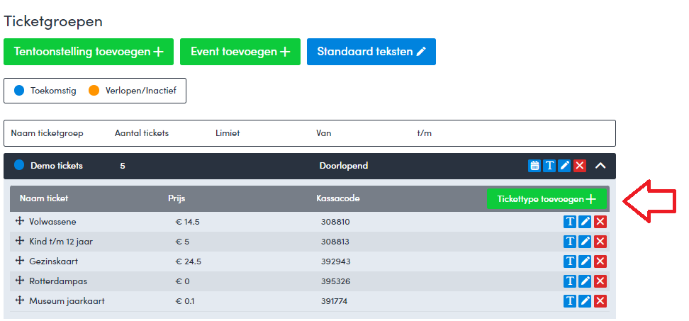 Een tickettype toevoegen kan bij de desbetreffende ticketgroep. Deze dient hiervoor eerst aangemaakt te zijn. Nadat de ticketgroep (een tentoonstelling of evenement) is aangemaakt, voeg je de tickets als volgt toe: