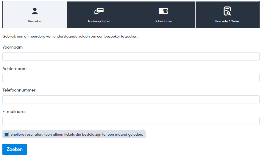 - Hier kan je op verschillende manieren een ticket opzoeken; de bezoekersgegevens, aankoopdatum, ticketdatum of ticket barcode/order nummer.