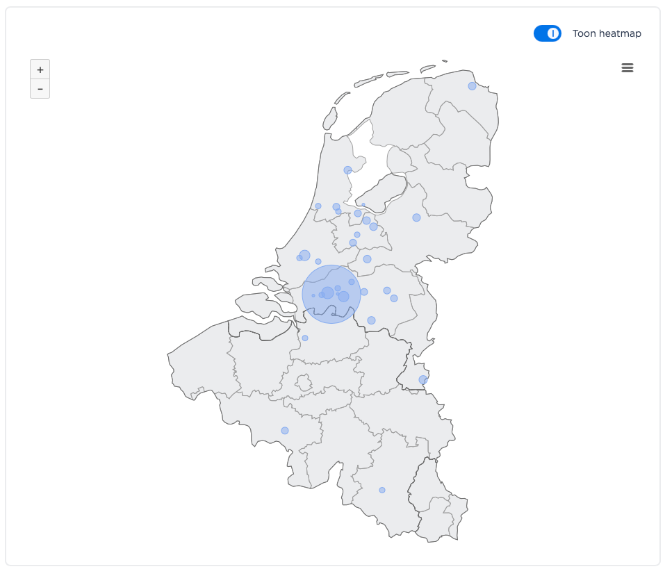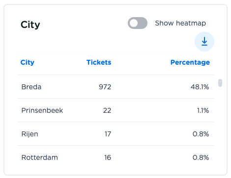 You can also switch to a "Heatmap" view. By means of this heatmap get a graphical view of where your vistors live. Furthermore, by clicking on a certain city, you can see the persons and their details who bought the tickets.