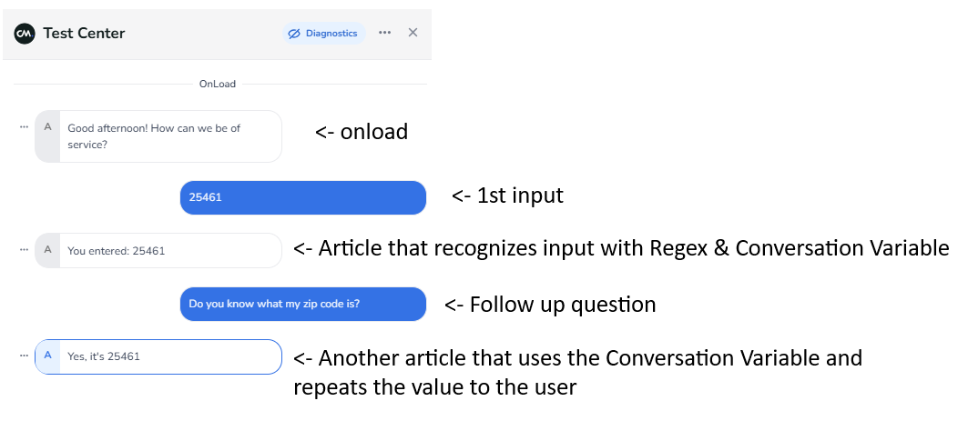 - Reusing the Variable: You can now use the Conversation Variable wherever you need to repeat the captured value across multiple articles, dialog nodes, or event answers. Example: