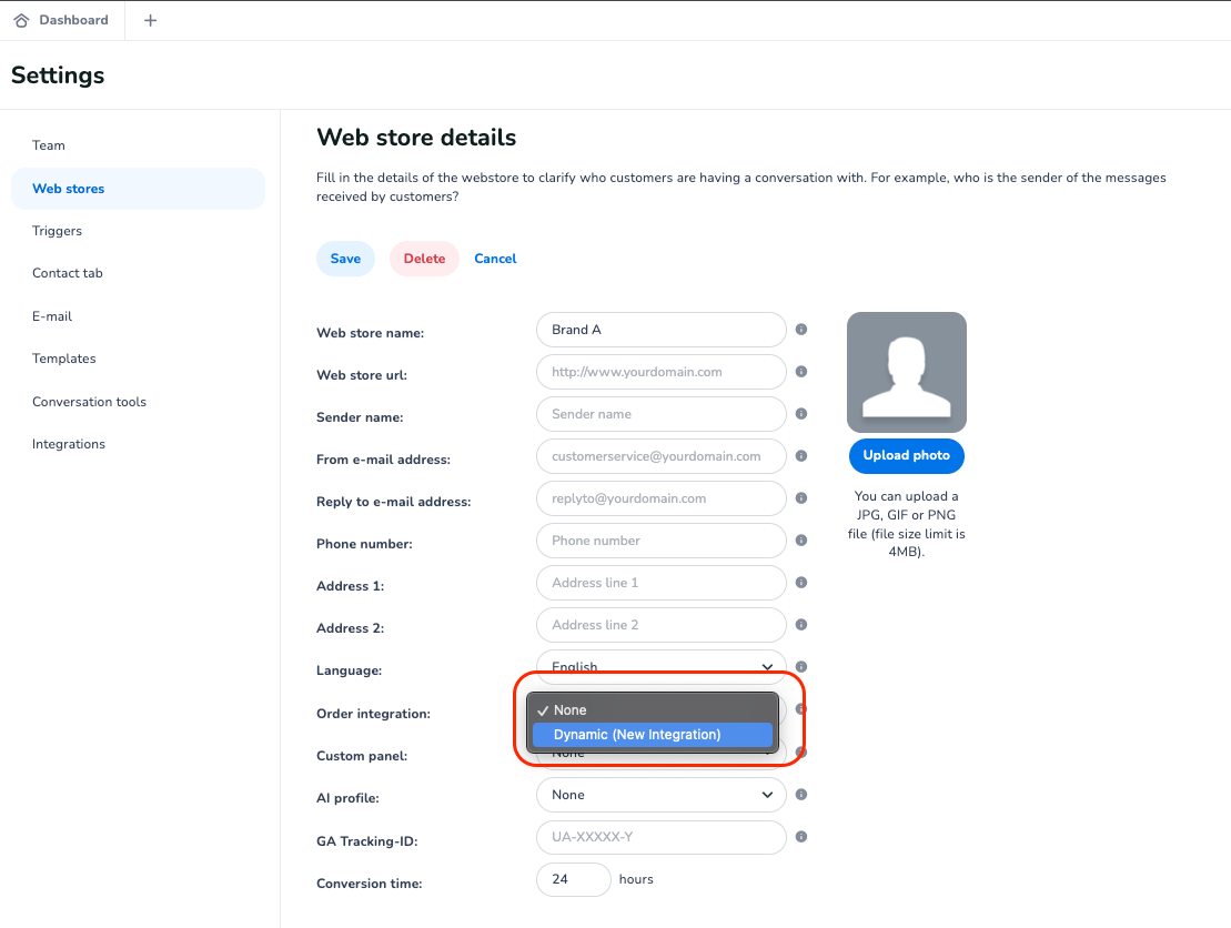 On the web store settings page, find the "Order integration" field, and select the 'Dynamic integration' you want to use for this webstore.