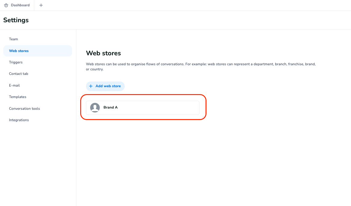 In the settings, navigate to the "webstore settings" page, and select the web store of choice (in the case Brand A)
