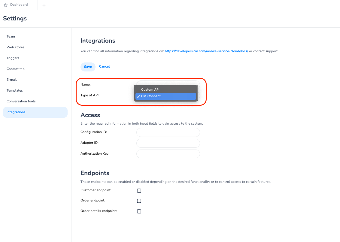 In the settings of Agent Inbox it is possible to easily configure standardised dynamic integrations endpoints that are available via the CM.com Marketplace connectors (Connect).