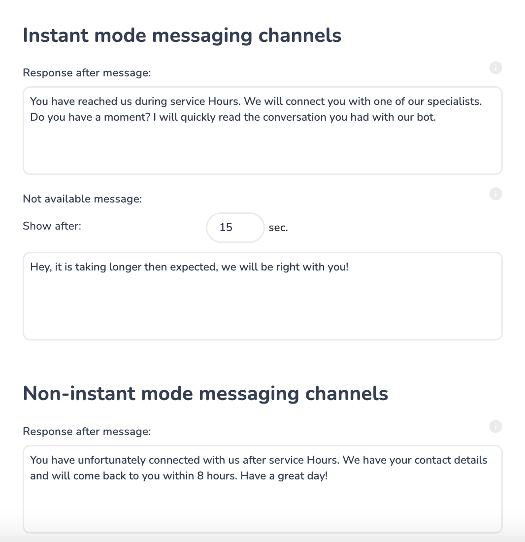 Determines the auto-reply text when at least one agent has an online presence AND has not reached its max instant conversations theshold.
