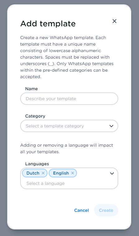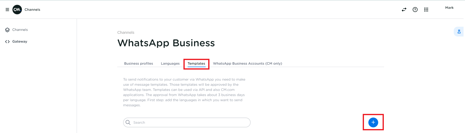 When you are unable to select a WhatsApp template, you will need to create one within you CM.com channels account. You can create a template using the following steps: