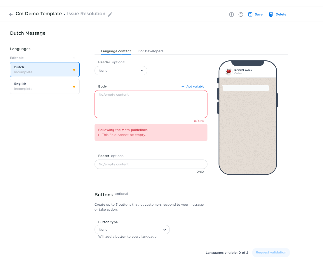 On the next page, you can create the template. Make sure the field "Body" is filled in, this is a mandatory field. The other fields are optional. When you are done creating the message in all the languages selected, click "Request validation" to finish.