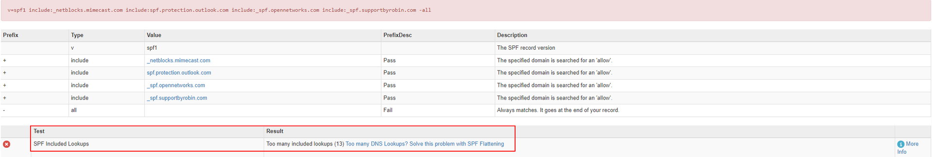 , which counts as one lookup. If that domain points to additional domains, those are added to the lookup total. For instance, Mimecast can add five lookups.