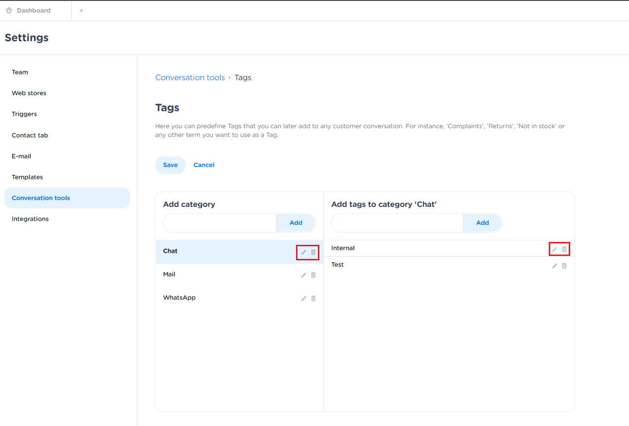 In this screen you can add a new category or tag, change the existing ones by clicking on the pencil or delete a category or tag using the trash bin icon (don't forget to use the "Save" button). To add a new category or tag, simply type your category or tag in the text field and click on the add button.