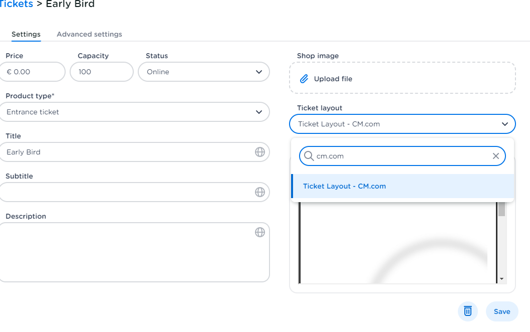 When you are in your ticket overview you can open a ticket type, you are now in the settings menu of the specific ticket. Here you have a drop-down function with ticket layout. Click on the dropdown to select your new ticket layout.