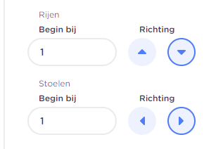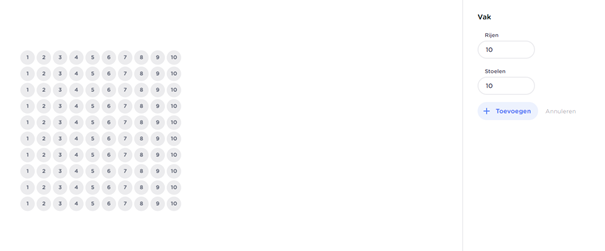 If you have opted for placed sale, a pencil will be visible next to the seat after saving. Click here to draw the section. And follow the next steps. Now enter on the right how large the section should be, for example 10 rows by 10 chairs. After pressing add, the section appears. Now click on the section to change various settings here. NOTE: The field or hall is always above the section in the map. Keep this in mind when drawing your venue section. Under the button 'numbering' you can start or, for example, let the row and seat numbers start with numbers of your choice.