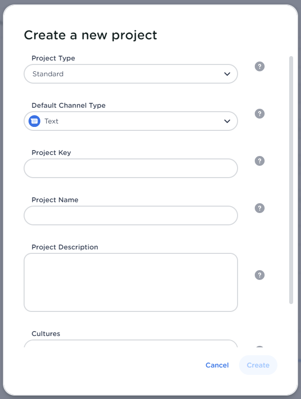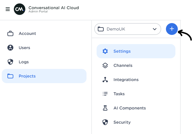 Create a new Conversational AI Cloud project in the project settings by clicking the blue “+” icon next to the selected project: