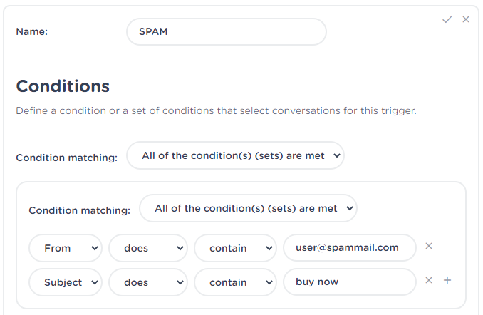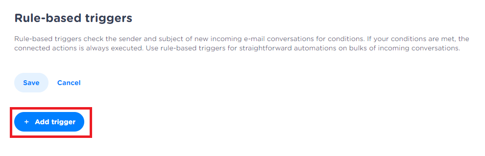 Within Mobile Service Cloud (MSC) it is possible to set triggers to route conversations. This card is about adding rule-based triggers. Rule-based triggers check the sender and subject of new incoming e-mail conversations for conditions. If the conditions are met, the connected actions are executed. Use rule-based triggers for straightforward automations on bulks of incoming conversations.