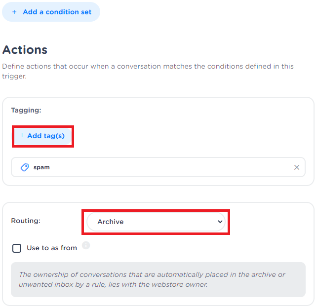 Add a tag to the conversation (optional) before it is routed, and choose if the conversation must be directed to the archive, or to the unwanted folder within MSC.