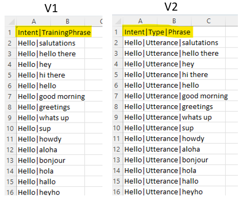 (Pay attention to the headers in row 1 for V1 & V2 of the intent model. If they look like V2, this guide should still work as long as the correct headers are used.)