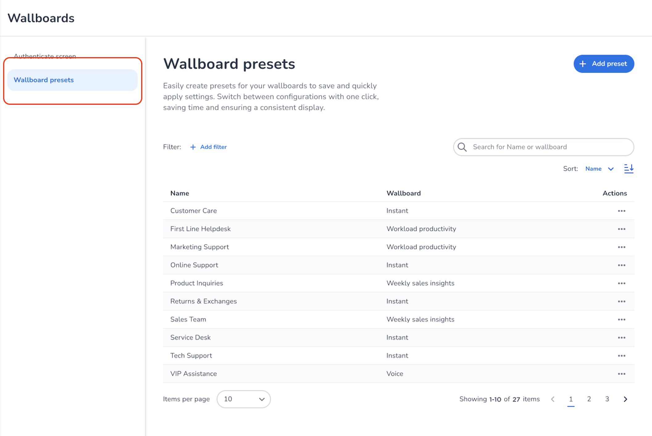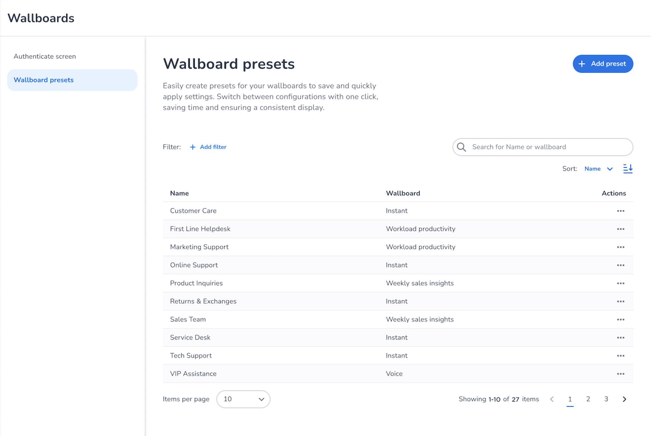 On the wallboard presets page, you can create, edit, or delete wallboard presets, as well as get an overview and navigate through all the presets you have already created.